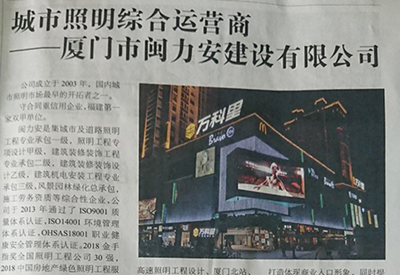 廈門市閩力安建設有限公司成立于2003年,公司取得市政公用工程施工總承包貳級、建筑裝修裝飾工程專業承包壹級、城市及道路照明工程專業承包壹級、電子與智能化工程專業承包貳級、消防設施工程專業承包貳級、電力工程施工總承包叁級、建筑機電安裝工程專業承包叁級、輸變電工程專業承包叁級、環保工程專業承包叁級、照明工程設計專項甲級、建筑裝飾工程設計乙級、施工勞務等資質的綜合型企業,公司于2013年通過了ISO9001質量體系認證,ISO14001環境管理體系認證,OHSAS18001職業健康安全管理體系認證。